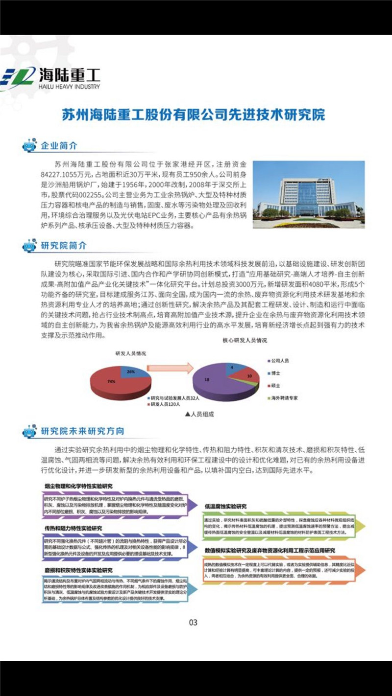 海陸重工一直秉承“科技領航,業界先鋒”的經營理念,專注于流程工藝中余熱、廢熱回收與環保技術相結合的技術研發,主營業務為主工業余熱鍋爐、大型及特種材質壓力容器和核電產品的制造與銷售,固廢、廢水等污染物處理及回收利用,環境綜合治理服務以及光伏電站EPC業務。本公司先進技術研究院瞄準國家節能環保發展戰略和國際節能環保技術領域科技發展前沿,以基礎設施建設、研發創新團隊建設為核心,采取國際引進、國內合作和產學研協同創新模式,打造“應用基礎研究-高端人才培養-自主創新成果-高附加值產品產業化關鍵技術”一體化研究平臺。