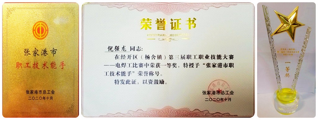祝賀我公司倪強龍在經(jīng)開區(qū)(楊舍鎮(zhèn))第三屆職工技能大賽 電焊工比賽中榮獲一等獎,并被 授予“經(jīng)開區(qū)(楊舍鎮(zhèn))技能 明星”榮譽稱號!